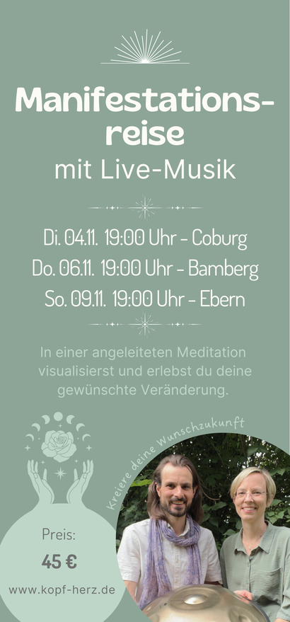 Du wirst eingeladen, tief in deine innere Welt einzutauchen, dich mit deiner Wunschzukunft zu verbinden und sie bereits heute mit allen Sinnen zu erleben und in kraftvollen inneren Bildern zu verankern. Die sanften, sphärischen Klänge der Handpan begleiten dich dabei.